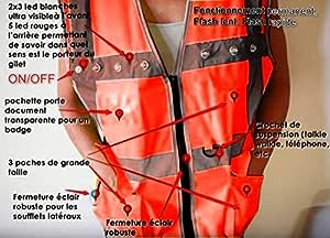Gilet Orange Pro de Sécurité Fluo à 11 LEDs Blanches Rouges Deluxe
