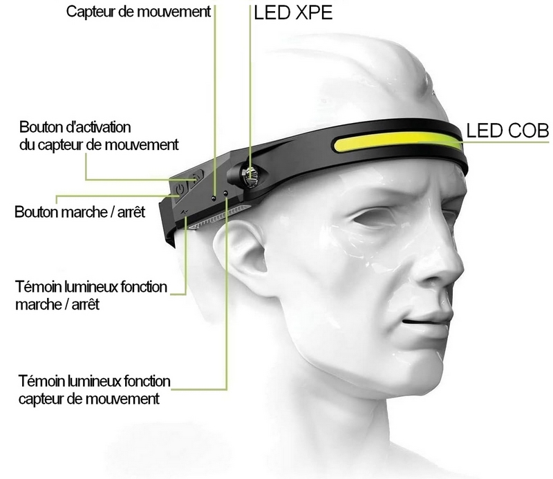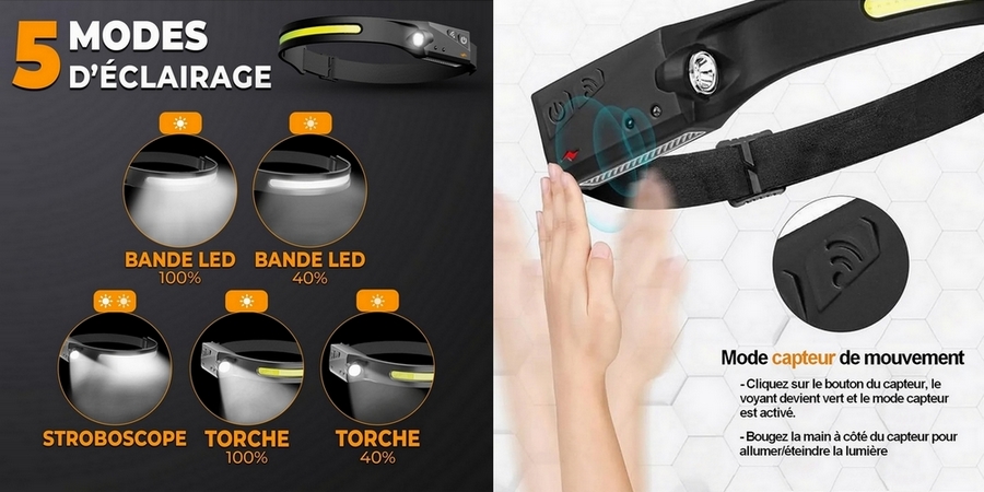Lampe Frontale à LED LedWarning : Lampe frontale led ultra puissante, conception d'éclairage à vision complète à 230°, la torche frontale a un bon effet lumineux 350 Lumen, une induction à la main, une batterie 1200 Mah et une étanchéité IPX6 Port de Charge Rapide USB : Lampe frontale rechargeable, facile à charger, 5 Mode : Allumez les modes de phare COB et d'éclairage latéral XPE en appuyant sur le commutateur, avec la fonction de clignotement COB High / COB Low / XPE High / XPE Low / COB et XPE. Petite et Légère. Cette lampe frontale rechargeable puissante ne pèse que 75g. Facile à régler, ferme et confortable. Super Lumineux dans L'obscurité: Cette lampe frontale à LED convient pour la course à pied, la marche, promener le chien, l'éclairage d'urgence, l'exploration, le camping, la réparation de voitures, la pêche, le vélo et les promenades par temps de pluie ou nuit. C'est aussi un beau cadeau pour la famille et les amis.